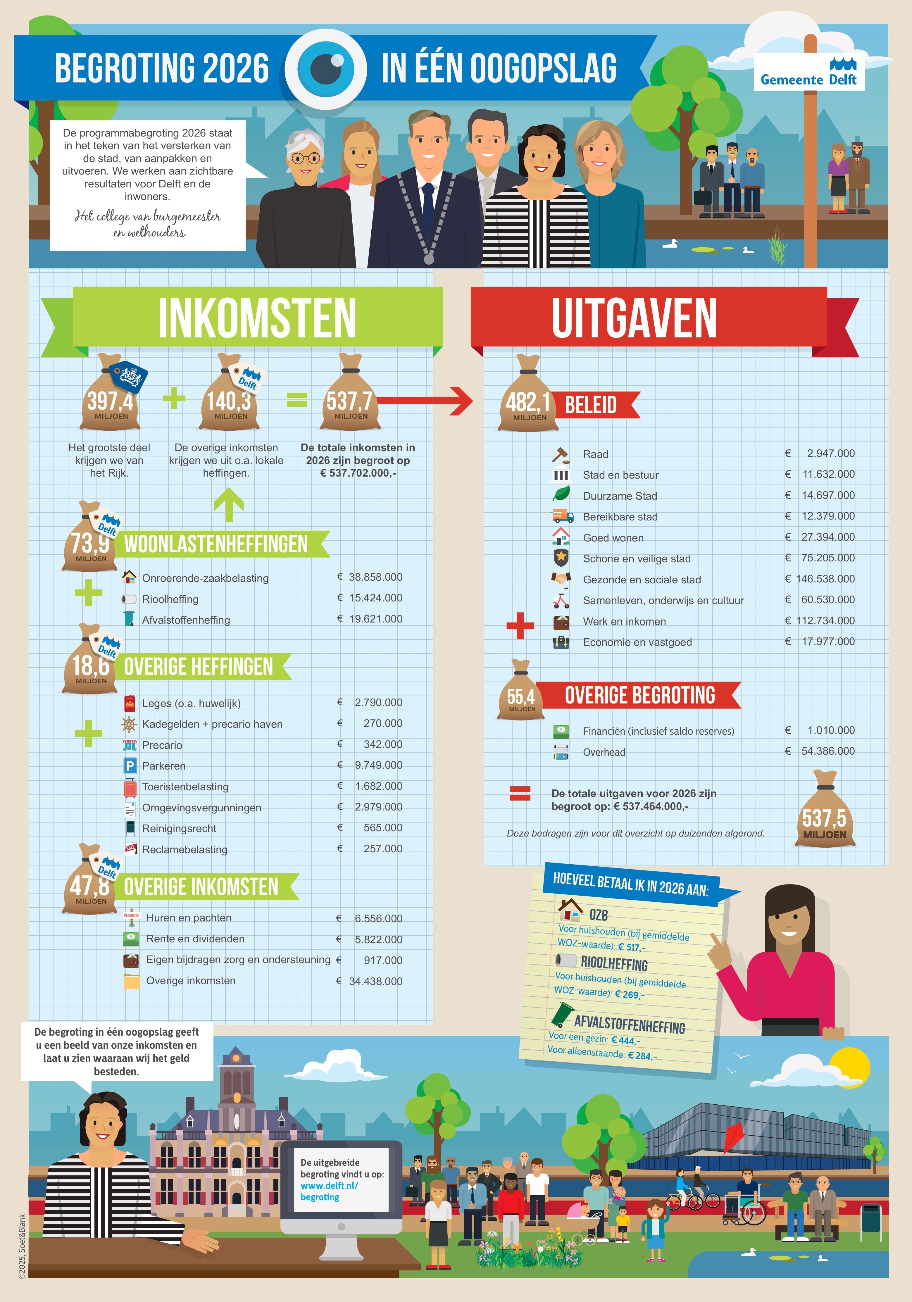 De Kadernota 2026 (vastgesteld op 3 juli 2025) bouwt voort op de koers die de raad en voorgaande colleges hebben ingezet en geeft de kaders voor een evenwichtige opbouw van de groeiende stad – met kansen voor iedereen. Voor de bestuurlijke accenten Delft kansrijk voor iedereen, Ruimte voor wonen, Een gezonde en veilige stad, Een duurzame stad en Economische kracht en bruisende stad en de langjarige opgaven Delft-West, Innovatiedistrict Delft en de energietransitie zijn bijstellingen verwerkt die bijdragen aan het uitvoeren en afmaken.