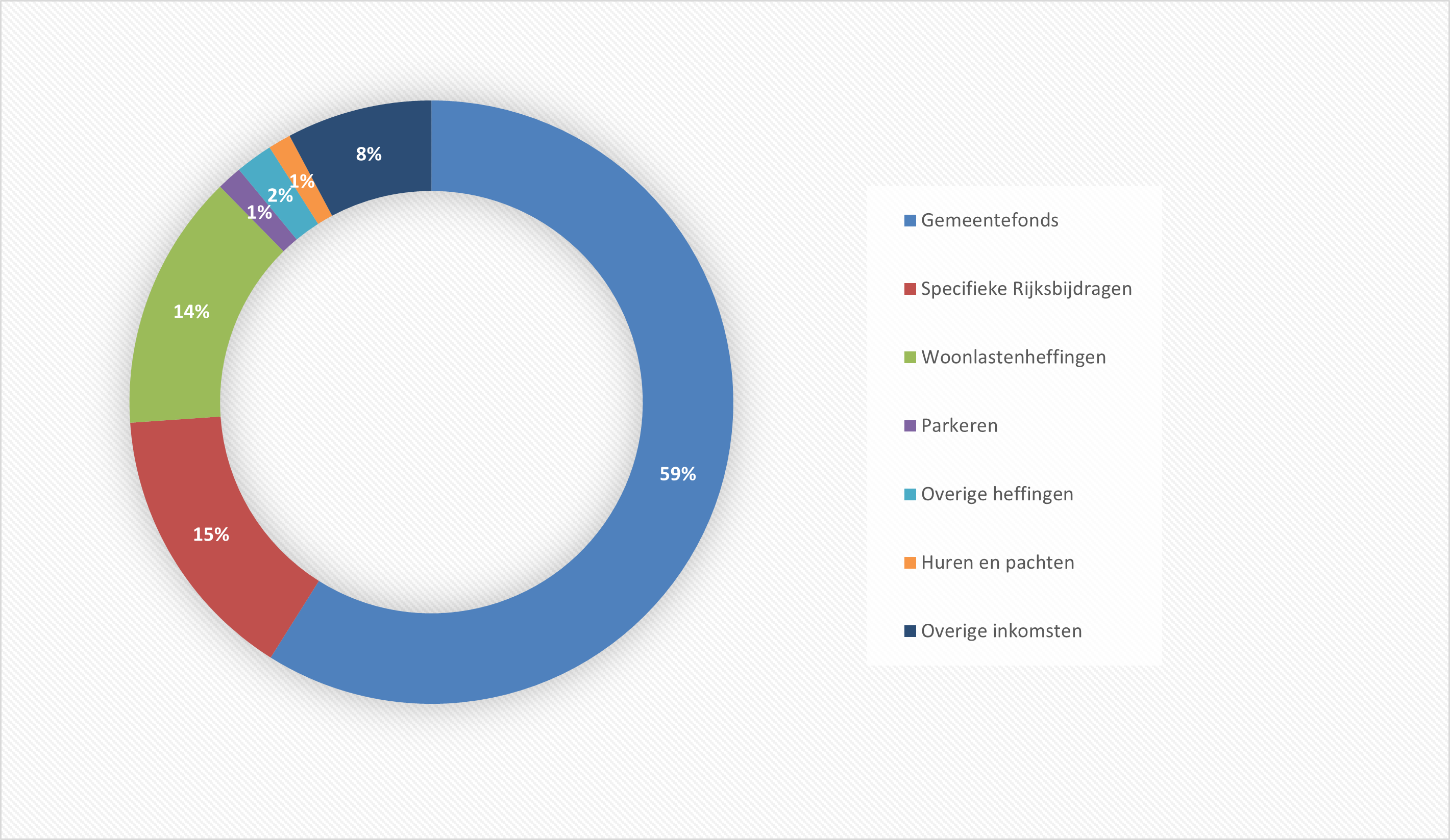 De inkomsten van het Rijk zijn de belangrijkste categorie en bestaan uit de uitkeringen uit het gemeentefonds en specifieke rijksbijdragen (bijvoorbeeld voor bijstandsuitkeringen). De eigen inkomsten omvatten de woonlasten (onroerendezaakbelasting (OZB), rioolheffing, afvalstoffenheffing), parkeerinkomsten, huuropbrengsten en overige inkomsten (onder meer rente/dividend, eigen bijdragen in het sociaal domein en verkoop gronden en panden).
